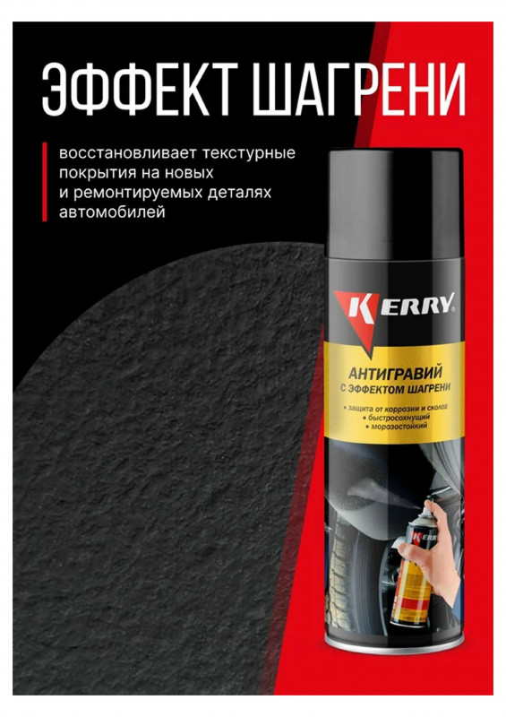 Профессиональное средство Антигравий KERRY® с эффектом шагрени KR-971 для восстановления текстурных покрытий на новых и ремонтируемых деталях автомобилей (колесные арки, пороги, крылья и т. п.) и создания долговременной защиты от летящих камней и песка, создающих интенсивную абразивную нагрузку. Способно предотвращать повреждения элементов нижней части кузовов легковых автомобилей и прочих транспортных средств. Обладает хорошей адгезией и звукоизоляционными свойствами, устойчиво к перепадам температур, сохраняет эластичность в холодное время года, не растрескивается и не отслаивается на морозе. Быстро сохнет, после высыхания может быть окрашено большинством эмалей.